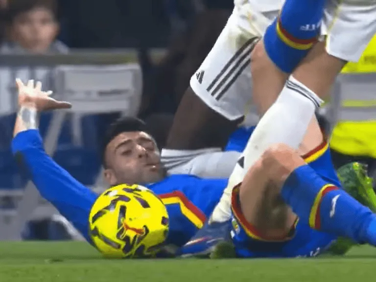 虎扑03月02日讯 当地时间周一晚,在西甲第26轮皇马vs赫塔菲的比赛中,第25分钟出现争议一幕。赫塔菲后卫迭戈-里科在与居莱尔拼抢后倒在边线附近,随后吕迪格在跑动中从其身旁经过,左膝击中里科的下颌和肩部。慢镜头回放显示,这次碰撞画面颇为惊险。不过主裁判穆尼斯-鲁伊斯当时未判罚犯规,VAR也没有介入改判。